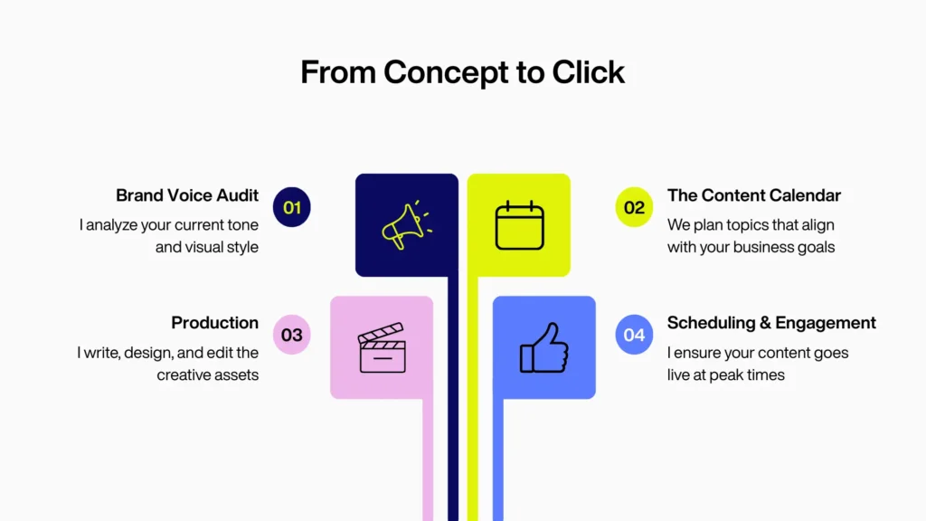 I work on a monthly approval cycle. We plan the content calendar at the start of the month, you approve it, and then I schedule everything out. This way, you always know what is going live.